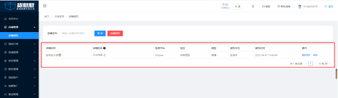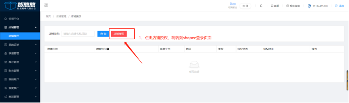 3.点击【店铺授权】按钮授权。跳转到Shopee登录页面。
