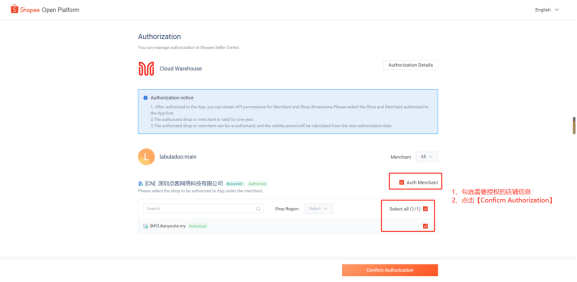 7.勾选需要授权的店铺信息,点击【Confirm Authorization】
