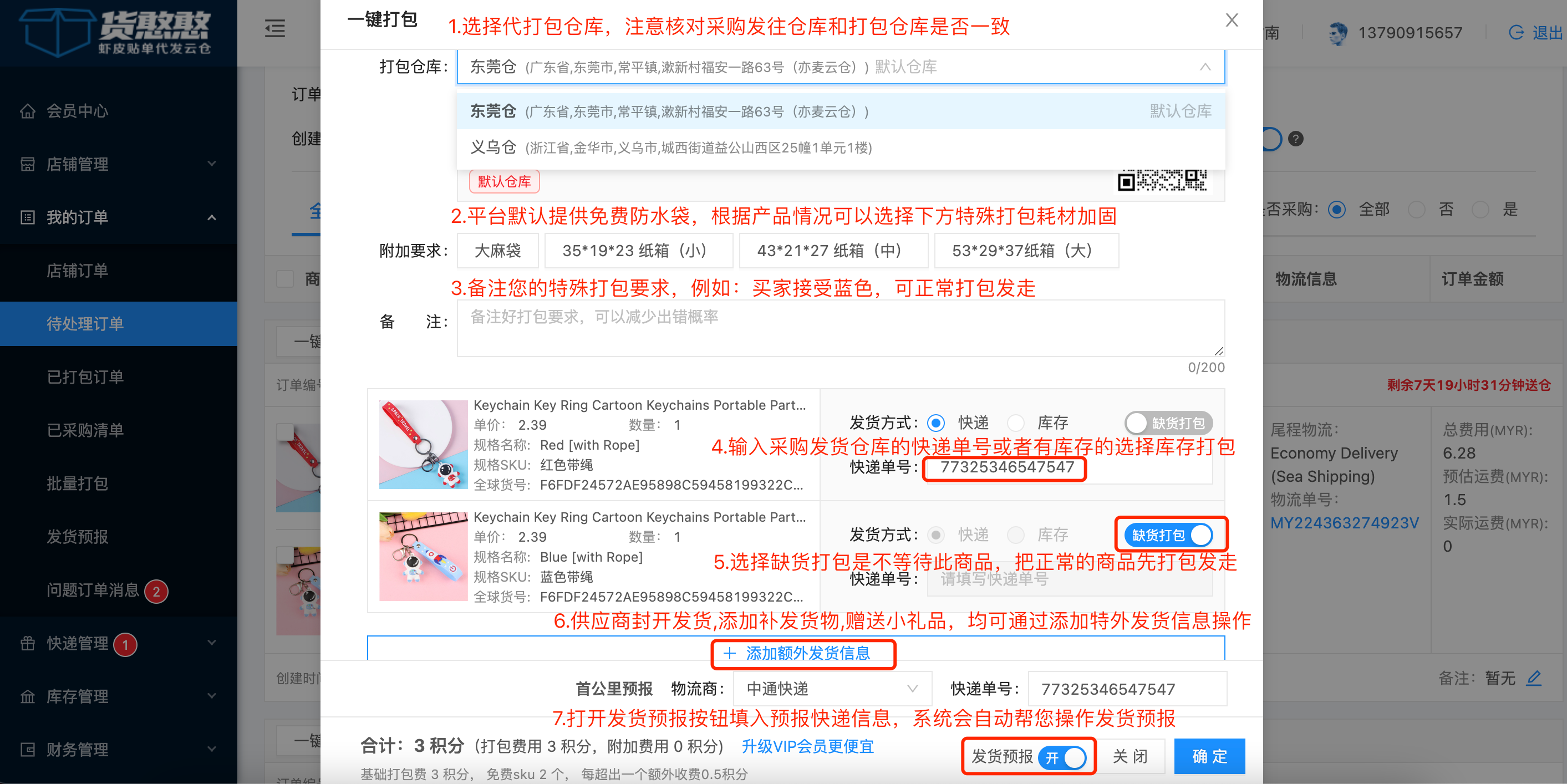 3、对货代仓库的备注  一般备注拆包,组合件,或者买家更换SKU等信息