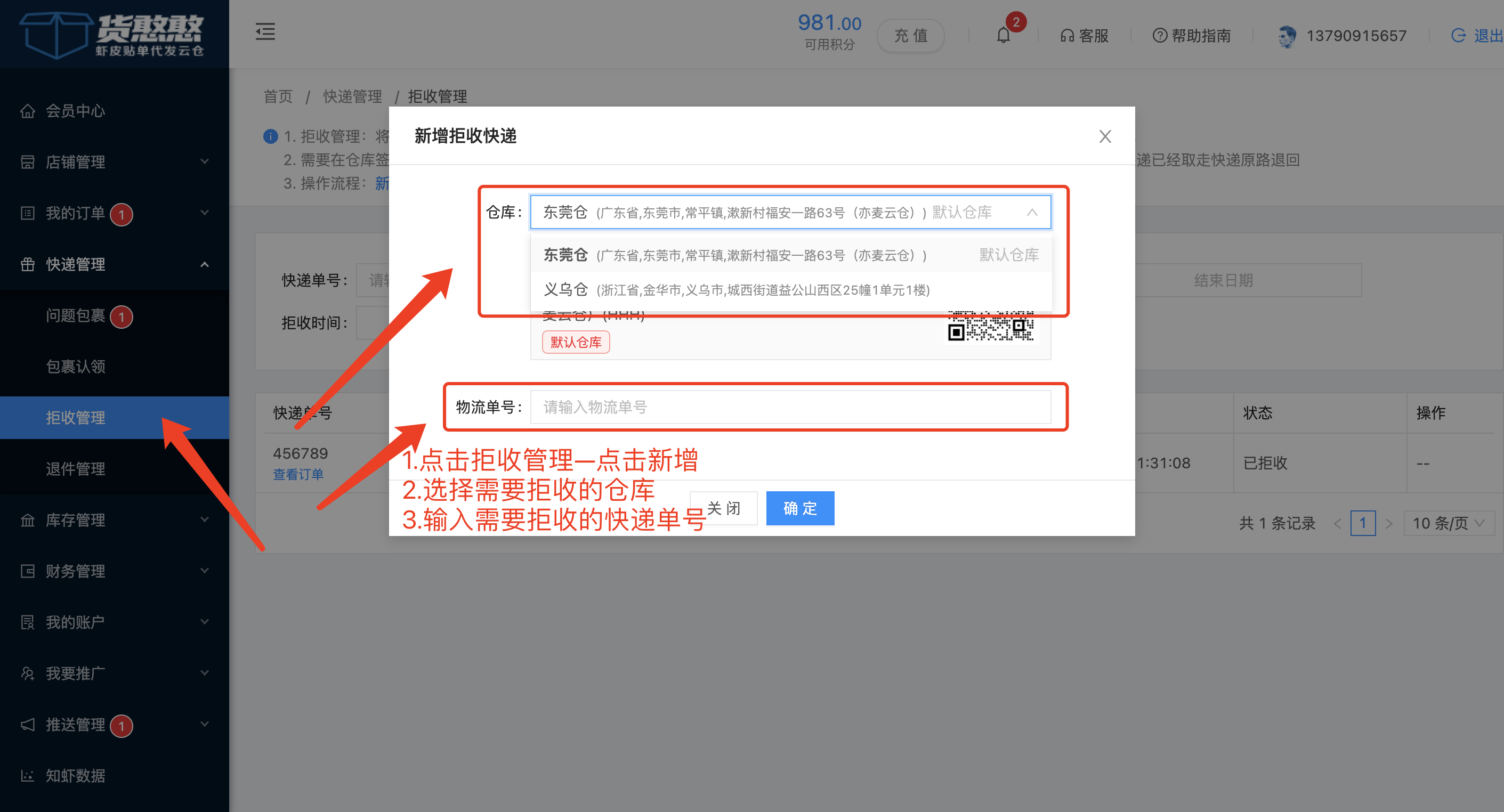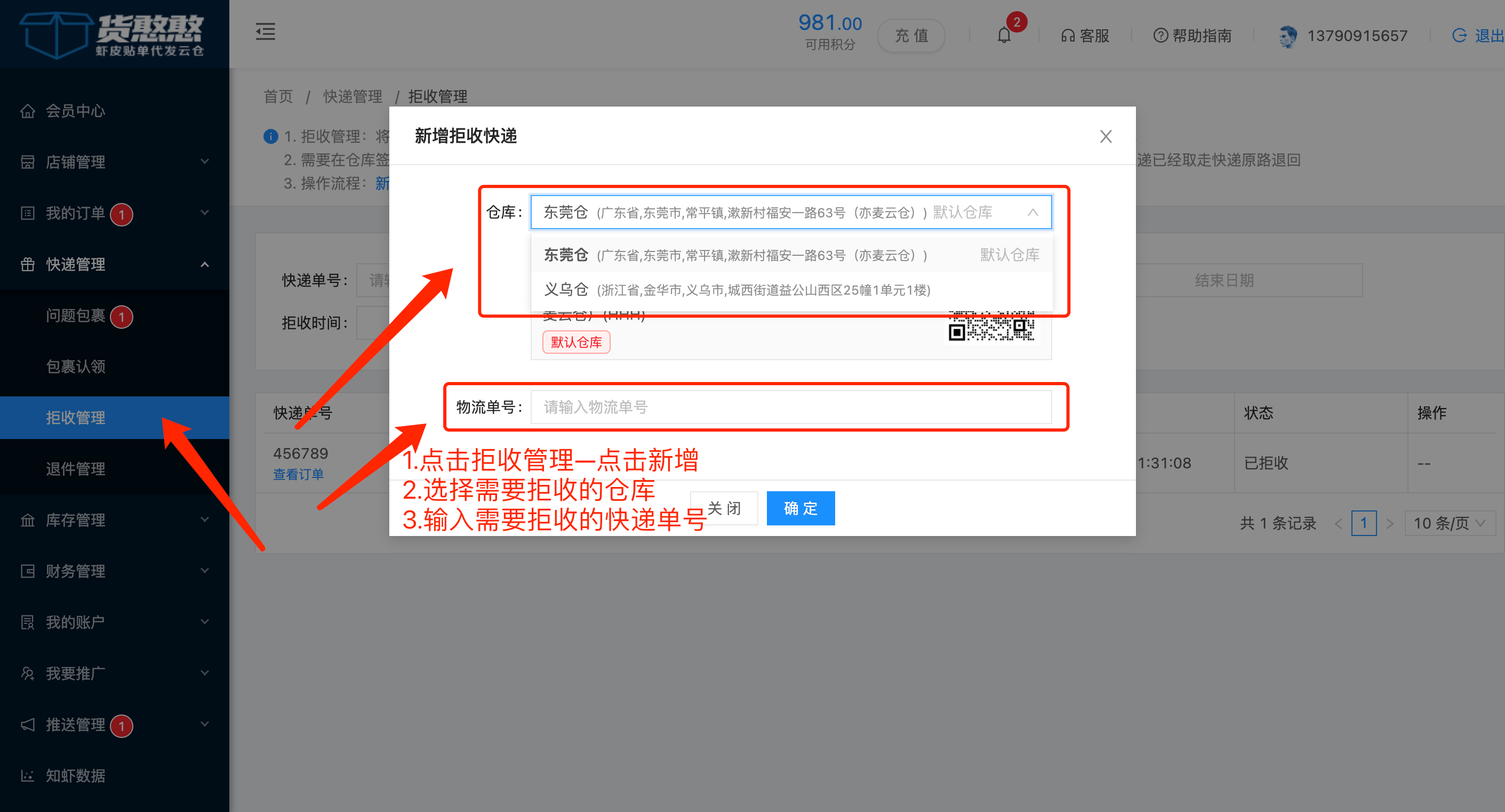 3、操作流程:新增---选择拒收仓库---填入需要拒收的快递单号---确定。
